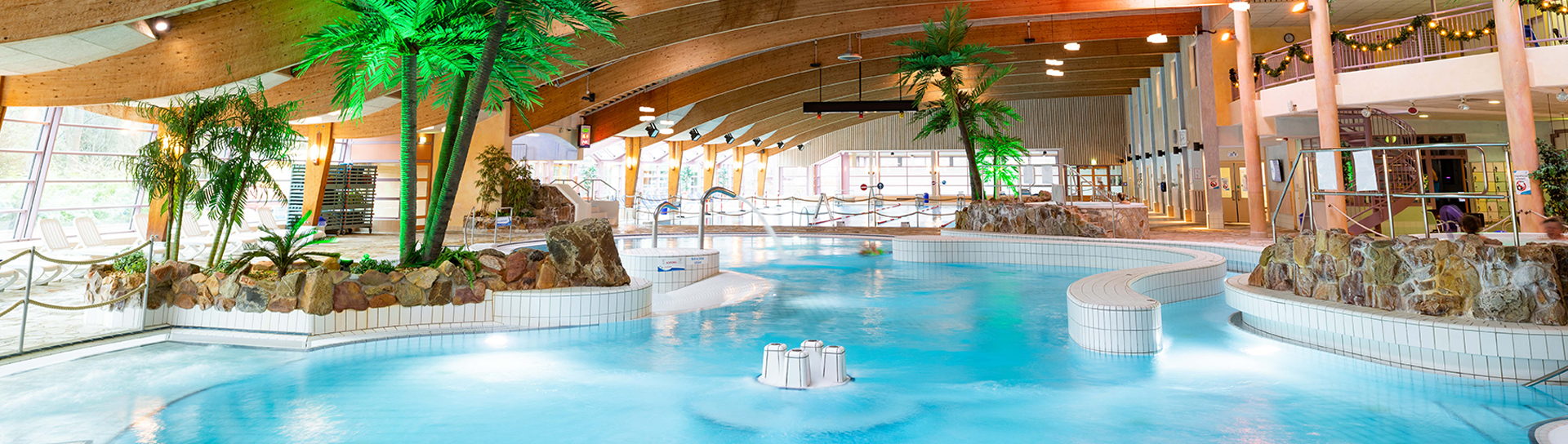 8.000 m² Wasserwelt mit Sport-, Kommunikations-, Soleaußen-, Spiel- und Kleinkinderbecken, zwei Whirlpools, Außenterrasse, Textilsauna, zwei Rutschen und Bistro.